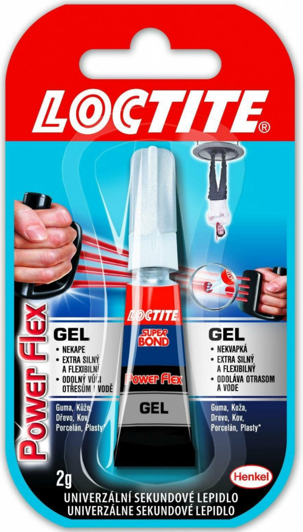 Loctite Super Bond Power Flex Gel je univerzální gelové vteřinové lepidlo pro rychlé opravy a lepení. Vytvrzuje během několika vteřin a lepí různé druhy materiálů jako je kov, porcelán, plast (kromě PE a PP), guma, kůže a dřevo. Není vhodné pro lepení skla, EPS a syntetických vláken. Nevhodné pro styk s potravinami.