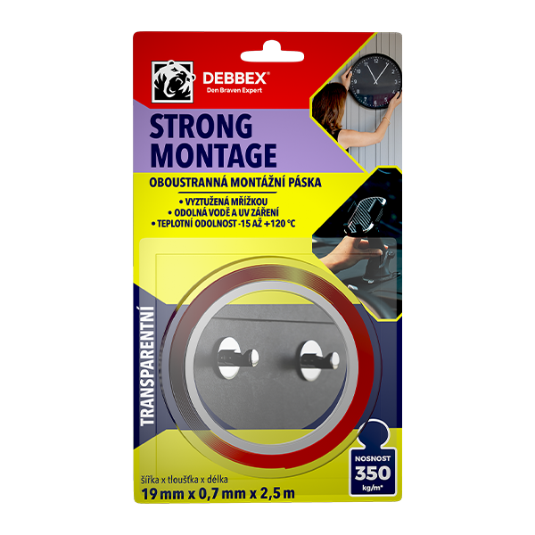 Oboustranná montážní páska STRONG MONTAGE s extra silnou akrylátovou lepicí vrstvou. Přilne k široké škále podkladů, a to velmi silně. Má velkou výhodu v okamžité plné přídržnosti, tím urychluje montáž a uvedení lepeného předmětu do provozu.