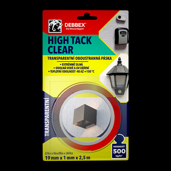 Oboustranná páska HIGH TACK CLEAR s extra silnou akrylátovou lepicí vrstvou. Přilne k široké škále podkladů, a to velmi silně. Má velkou výhodu v průhledném spoji a okamžité plné přídržnosti, tím urychluje montáž a uvedení lepeného předmětu do provozu.